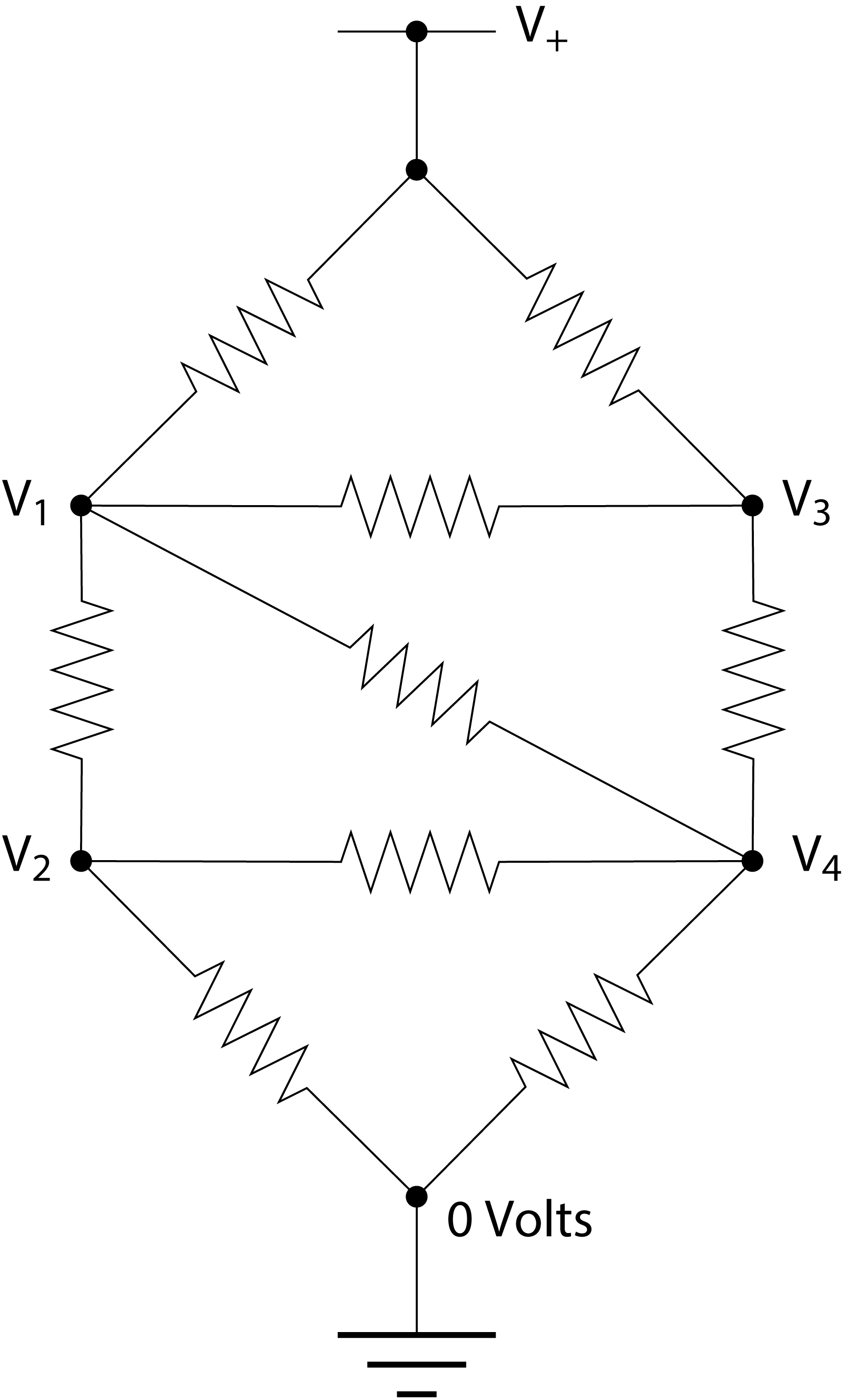 To answer this question we use Ohm’s law and the Kirchhoff current law, which says that the total net current flow out of (or into) any junction in a circuit must be zero. Thus for the junction at voltage \(V_1\), for instance, we have \begin{equation} {V_1-V_2\over R} + {V_1-V_3\over R} + {V_1-V_4\over R} + {V_1-V_+\over R} = 0, \end{equation} or equivalently \begin{equation} 4V_1 - V_2 - V_3 - V_4 = V_+. \end{equation}